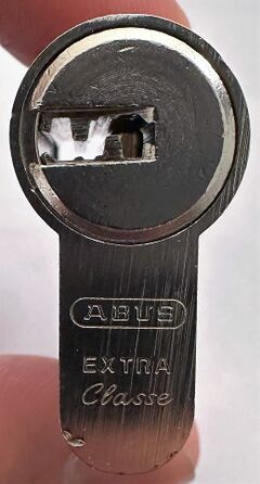 The Extra Class 750, commonly referred to by its model number EC750 is a Euro profile cylinder made by ABUS. It is a dimple lock that uses the flat side of the key blade as a bitting area.