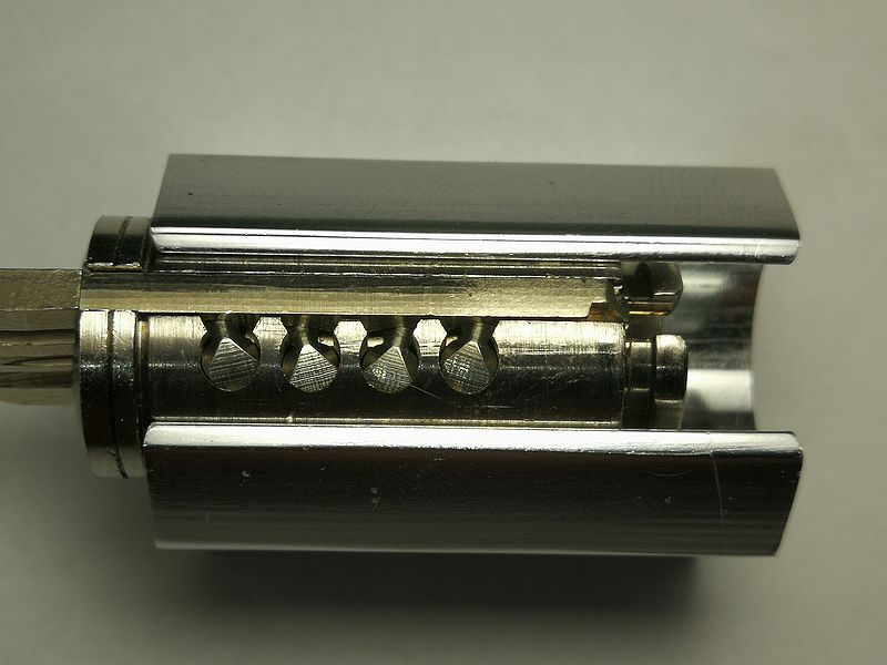 Revision as of 21:30, 11 January 2023 by Sandplum (talk | contribs) ({{Information |Description=IKON TK5 plug, view of sidepins rotated with key. |Author=Reinder Stegen |Source=Submitted to Lockwiki by author. |Date=6 August 2021 |Permission=Licensed under Creative Commons Attribution/Share-Alike 3.0. }} )