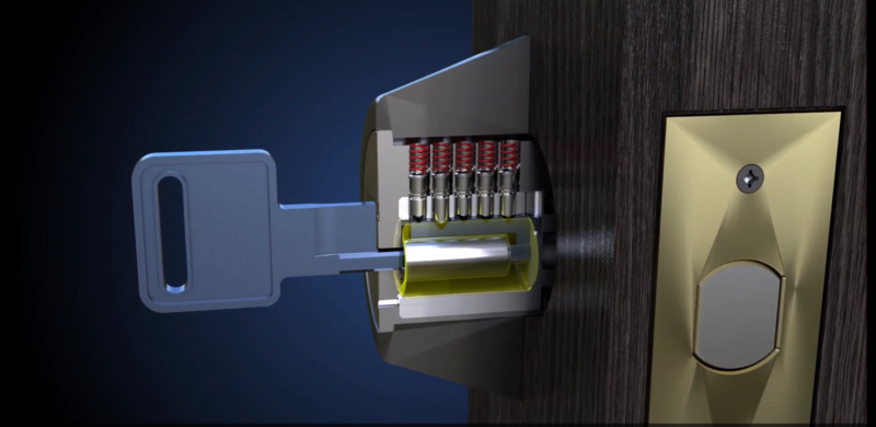 A model of a Bowley deadbolt, key inserted.
