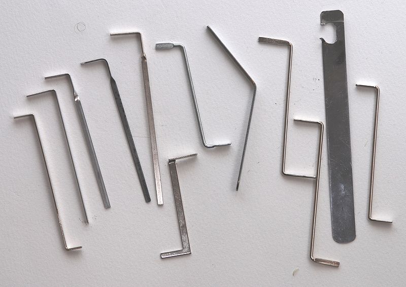 A variety of pin-tumbler, wafer, and dimple tension tools. |
